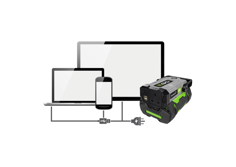Harness the unrivalled power of EGO’s ARC Lithium™ battery technology with the EGO Power+ Nexus Escape. Compatible with any EGO battery the Nexus Escape provides power wherever you need it, whenever you need it. Built tough with a 240V AC power outlet and 2 USB ports, the Nexus Escape provides flexible power to charge mobile phones, laptops, cameras, lights and other electrical devices up to a maximum output of 150Watts. Ideal for camping trips, beach visits, festivals or for use at home, the Nexus Escape is lightweight and small enough to carry in a rucksack or store in a tent. With the power to run a 42” television for up to ten hours, charge 27 mobile phones or 5 laptops, the EGO Power+ Nexus Escape can deliver all the power you need, when you need it. (Based on a 7.5Ah battery)